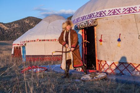 SHYMKENT, KAZAKHSTAN - MARCH 22, 2023: Kazakh man in traditional Kazakh warrior costumes at celebration of Nauryz