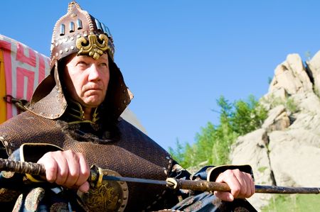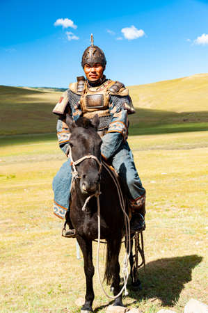 Ulan Bator, Mongolia - August 25, 2016: a Horseman is greeting visitors at the entrance to the Mongolia 13th century National Park built as a whole village in the style of the 13th century.