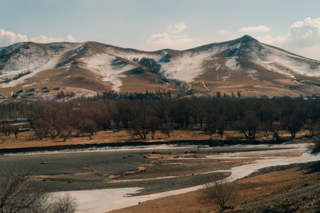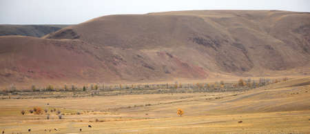 Dry Mongolian landscapes in the Altai Mountains, wide landscape.