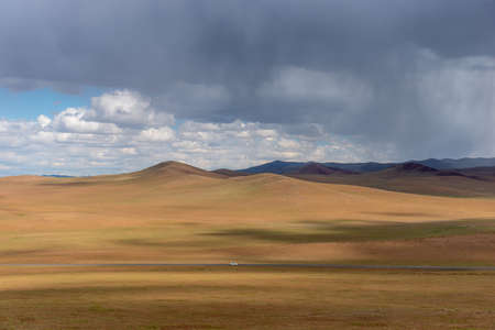 Aerial view of steppe and mountains with rain landscape in Orkhon valley, Mongolia
