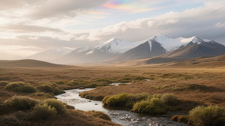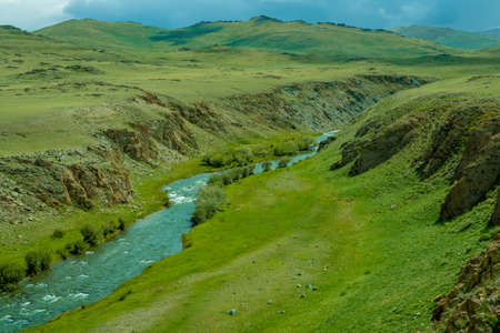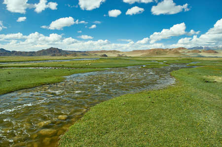 Mongolian Altai. Current mountain stream, Scenic valley on the background of the snowcapped mountains.