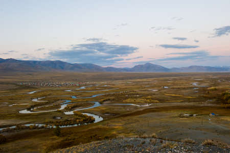 Top view of the Altai Russian village of Ortolyk, the steppe and Altai mountains at sunset, the Chuya river, Siberia, Russia.