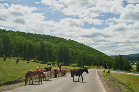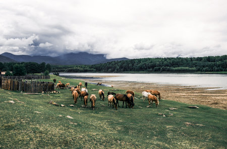 Mare with a cute foal on the pasture, Typical Mongolian landscape, Uvs Province in Mongolia