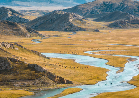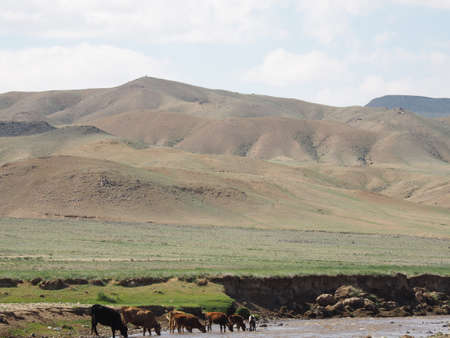 The Chuluut River flow through the mongolian steppe, under blue sky, withe clouds with a herd of cattle in the background, The beautiful landscape of Mongolia. Cows graze in backround.