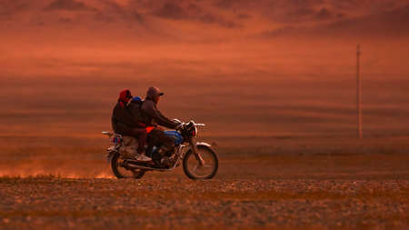 On a motorcycle in the Gobi desert. Dust from under the wheels. Wild Mongolian road. 06.09.2019. Gobi Desert, Mongolia.