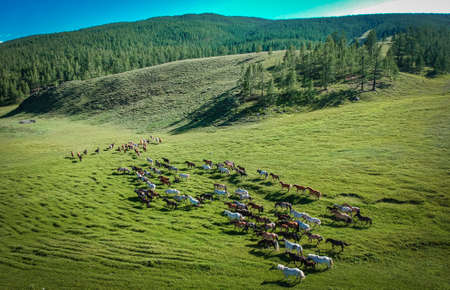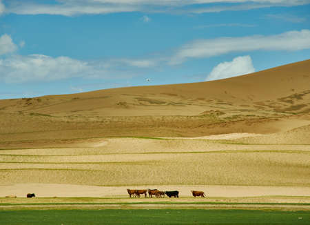 Mongolia. Sands Mongol Els dunes . Herds graze in the spring green valley