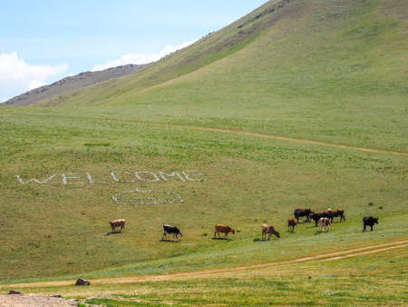 Beautiful green meadow with cows in Mongolia. Summer landscape.