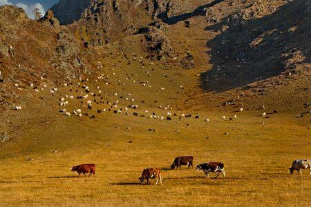 Russia. mountain Altai. A flock of sheep and a herd of cows graze on the slopes of steep rocks near the village of Ongudai