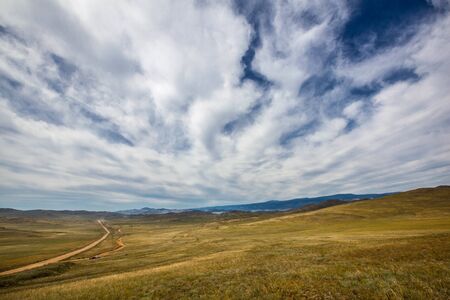 Morning in the Kurai steppe, dirt road through the hills. Kosh-Agachsky District, Altai Republic, Russia
