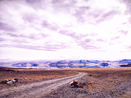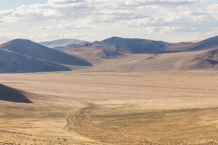 Landscape of a road through the steppe and mountains in Western Mongolia. Travel.
