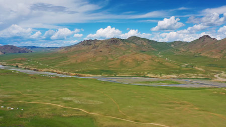 Aerial view of steppe and mountains landscape in Orkhon valley, Mongolia