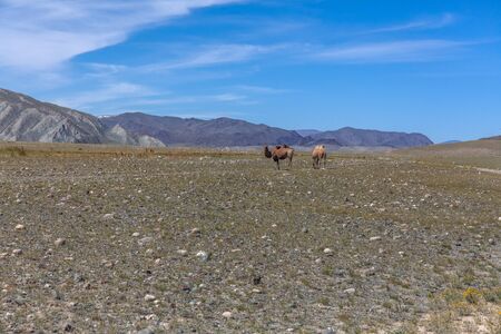 Camels pasture in western Mongolia steppe with mountains in the background. Altai, Mongolia.