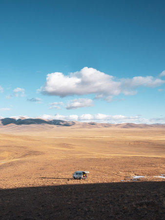 Old van parked in mountain steppe field, extreme travel on endless expanses.