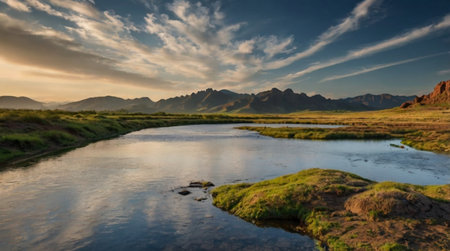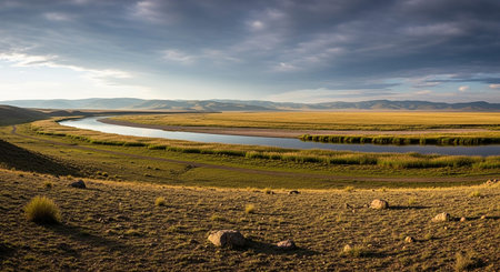 Grassy showing wide panoramic view of a winding river through a grassy plain under a dramatic cloudy sky keywords: river, winding, plain, grassland,...