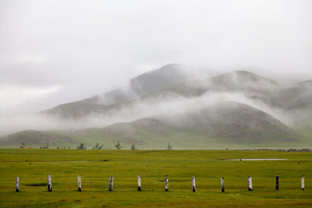 Fog covering the hilltops near the Waterfall Ulaan Tsutgalan in the Orkhon valley.