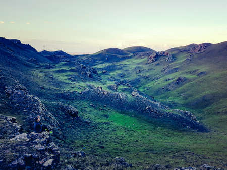 View of the mountain valley. The hills under a colorful sky.