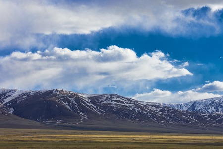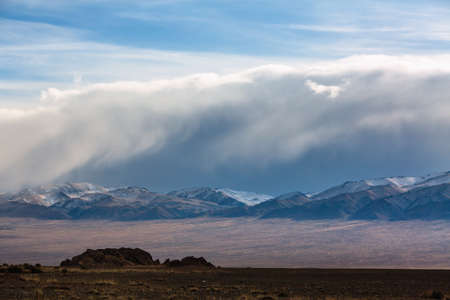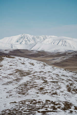 Soft focus. Withered grass field, snow covered mountains, cloudy sky. Mongolian landscapes and landmarks. Yellow steppe and dark mountains at sunset. Blue sky with clouds.