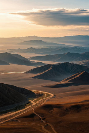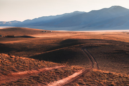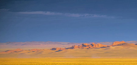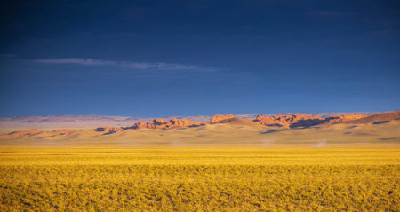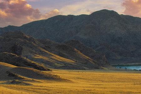 Dry Mongolian landscapes in the Altai Mountains at sunset