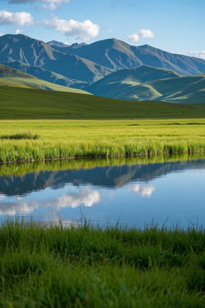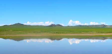 Mongolian grassland reflected in the water of a lake