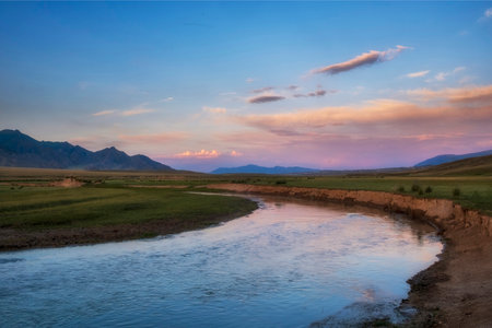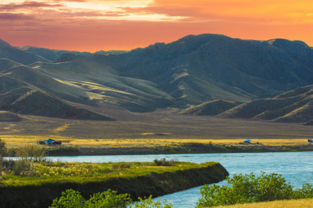 Enjoy a breathtaking sunset in Central Asia. Discover unique rock formations along the river. Explore the beauty of the steppe landscape at dusk.