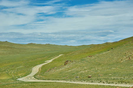 Winding dirt road through lush rolling hills of Central Mongolian steppe. Mongolian Altai. Typical view of Mongolian landscape.