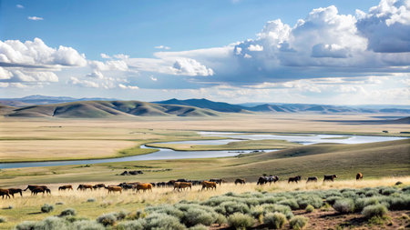 Autumn grassland and river in the steppe, Mongolia.