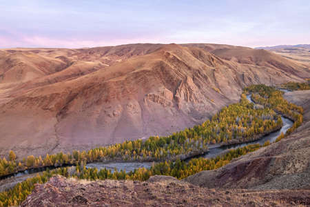 Mountain river in the valley with a view of yellow larches, mountains and autumn at dawn. Altai, Russia.