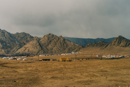 Little village of nomadic Yurt camp in the Mongolian Steppe at Terelj National Park