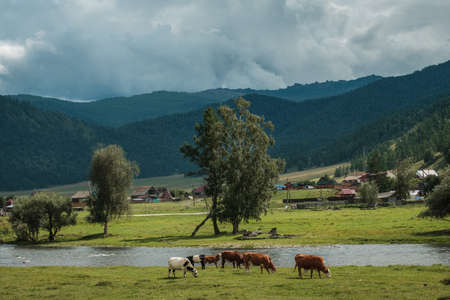 Cows grazing in summer in a meadow in the Altai Mountains.