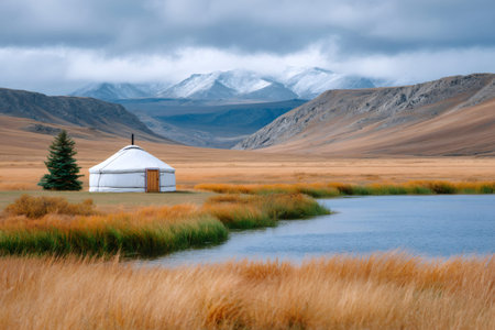 Yurt standing next to a lake in a vast autumn steppe with distant snow-capped mountains