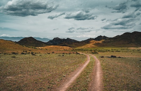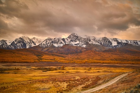 Road in the autumn mountains. View of North-Chuya mountain ridge in Altai, Siberia, Russia.