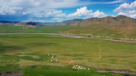 Aerial view of yurts in steppe and mountains landscape in Orkhon valley, Mongolia