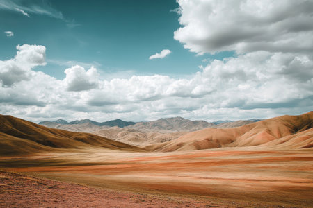 Vibrant panoramic landscape of colorful rolling hills beneath a fluffy cloud dotted sky