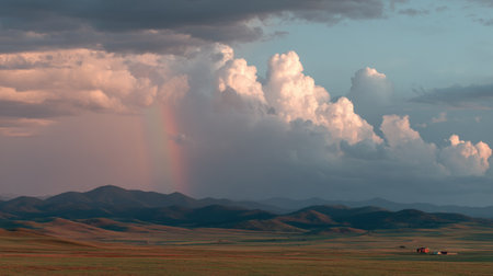 A breathtaking view of a landscape featuring a rainbow arching over distant mountains and billowy clouds under a dramatic sky, capturing serene beauty in nature.