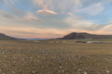 a small Mongolian settlement in the mountains of Altai at sunset
