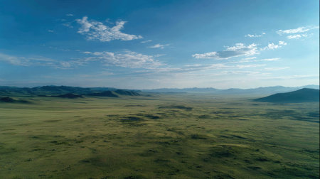 This image captures a vast green landscape stretching under a clear blue sky, characterized by soft clouds and rolling hills, evoking tranquility and natural beauty.