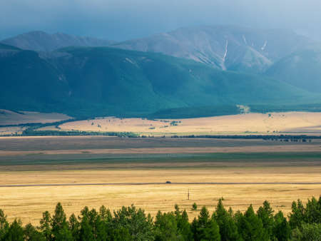Steppe plain with yellow sand. Yellow soil under hot sun. Mountain empty valley. Travel Altai.