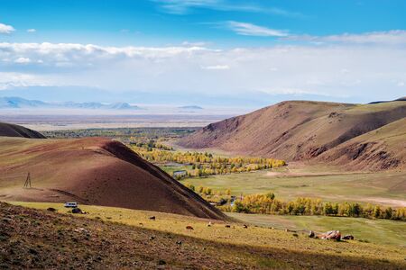 Autumn in the valley of the Kyzylshin River, view from the top of the hill. Kosh-Agachsky District, Altai Republic, Russia