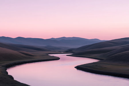 A serene river winding through rolling hills, with a gradient sky blending from soft pink near the horizon to a deep, dusky purple above. The river_s surface mirrors the gradient, with the hills in su .jpg