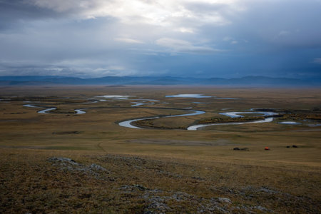 Grassy showing wide panoramic view of a winding river through a grassy plain under a dramatic cloudy sky keywords: river, winding, plain, grassland,...
