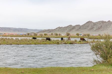 Mongolia landscape. Altai Tavan Bogd National Park in Bayar-Ulgii. Cows eat grass on the island.