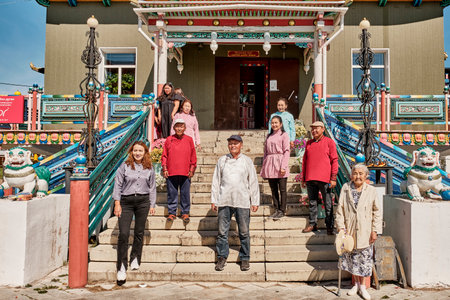 Pilgrims from Mongolia on stairs of Buddhist temple. Ivolginsky datsan, Buryatia, Russia