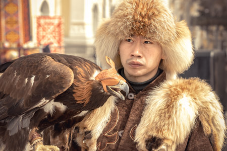 Almaty, Kazakhstan - March 23, 2024. Guy in a national Kazakh costume and a traditional fur hat holds a hunting falcon in her hands. Berkutchi. Portrait