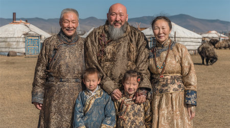 big buryat (mongolian) family: grandmother, grandson with wife and children, in national costumes