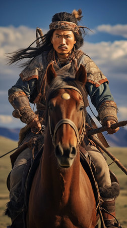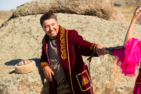 SHYMKENT, KAZAKHSTAN - MARCH 22, 2023: Kazakh man in traditional Kazakh warrior costumes at celebration of Nauryz