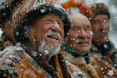 Three men in colorful traditional hats pose against a stunning mountainous backdrop during a cultural event.