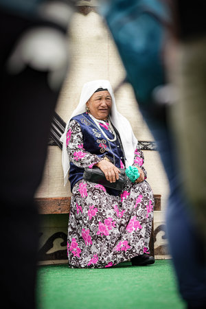 ISTANBUL, TURKIYE - JUNE 11, 2022: Central Asian old woman in Etnospor Culture Festival