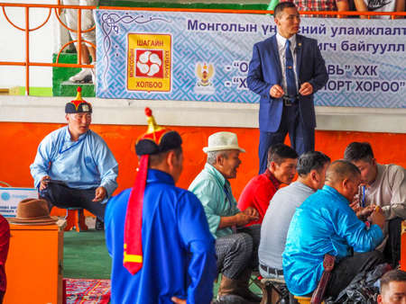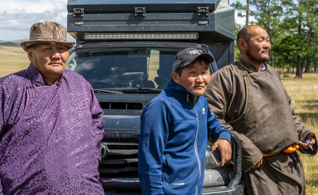 Tsagaan-Uul, Mongolia - August 11, 2019: Portrait of a Mongolian men in traditional clothes with cigarette in front of a car.