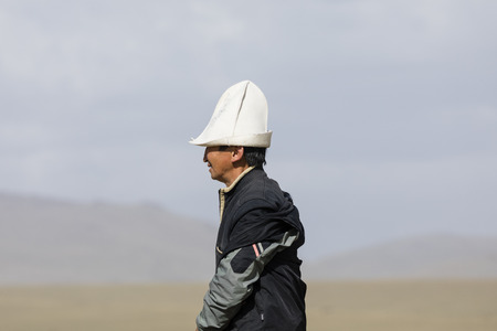 Song Kul, Kyrgyzstan, August 8 2018: Portrait from the side of a Kyrgyz with his traditional headgear