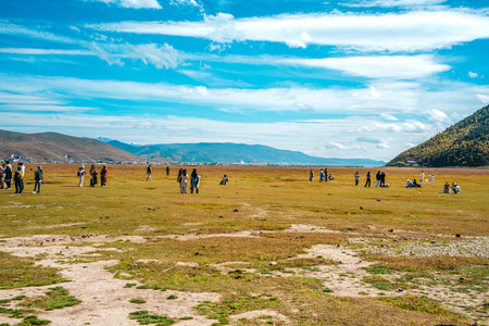 A wide, panoramic landscape showing the immense scale of the Yila Grassland and Napahai Lake, with people scattered across the plain.